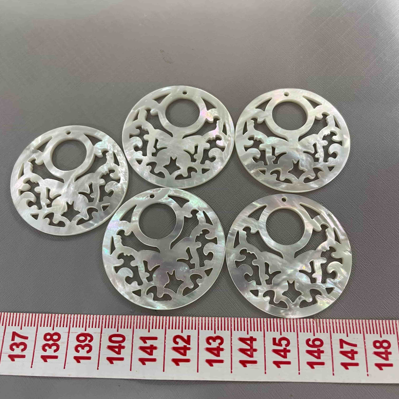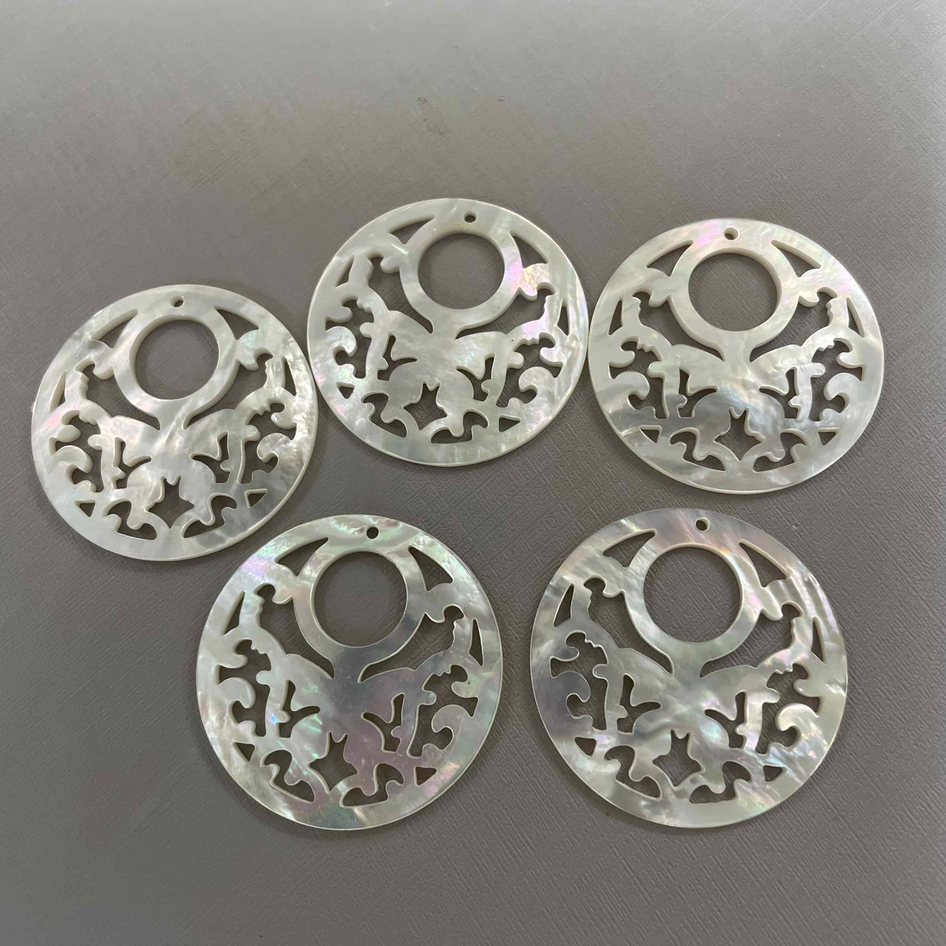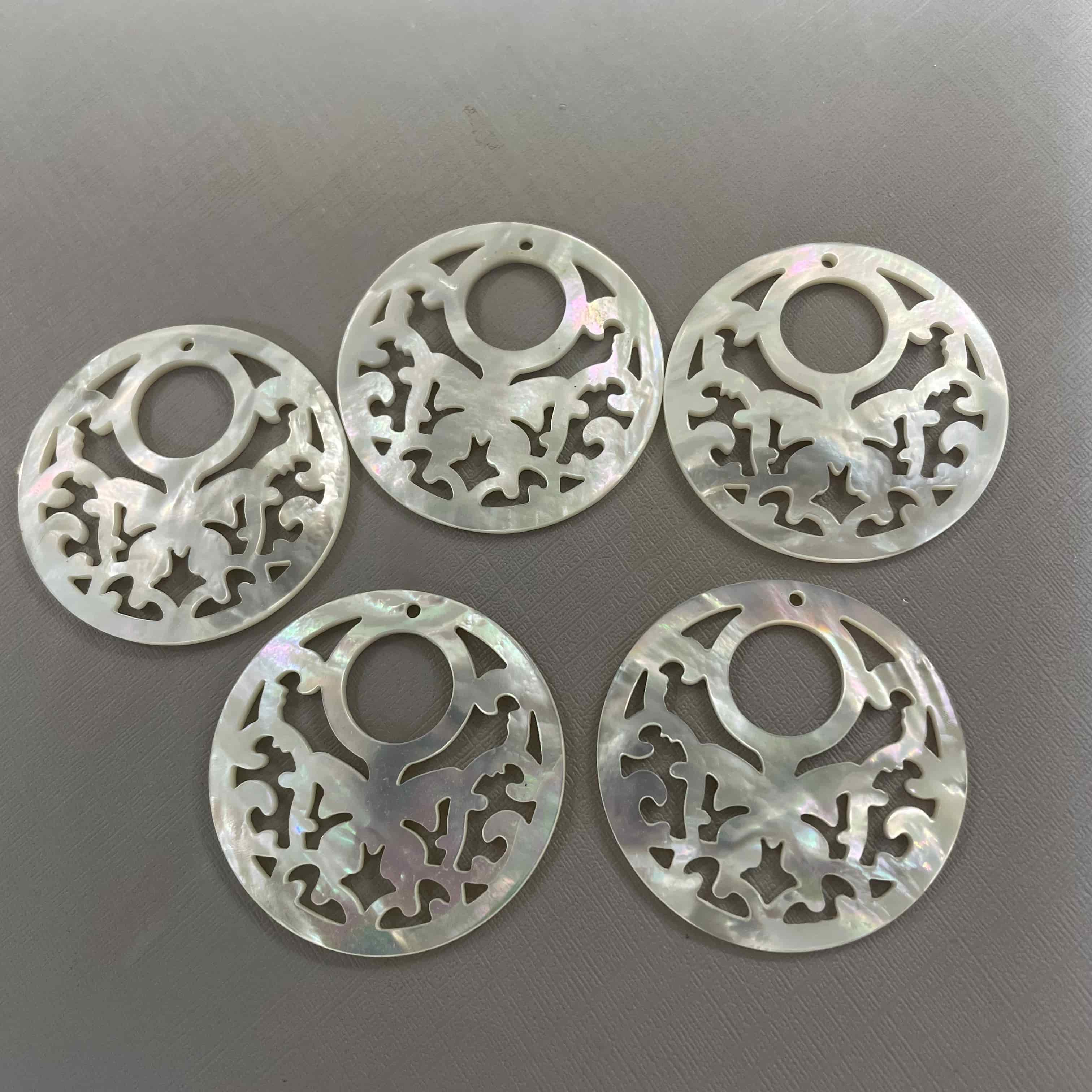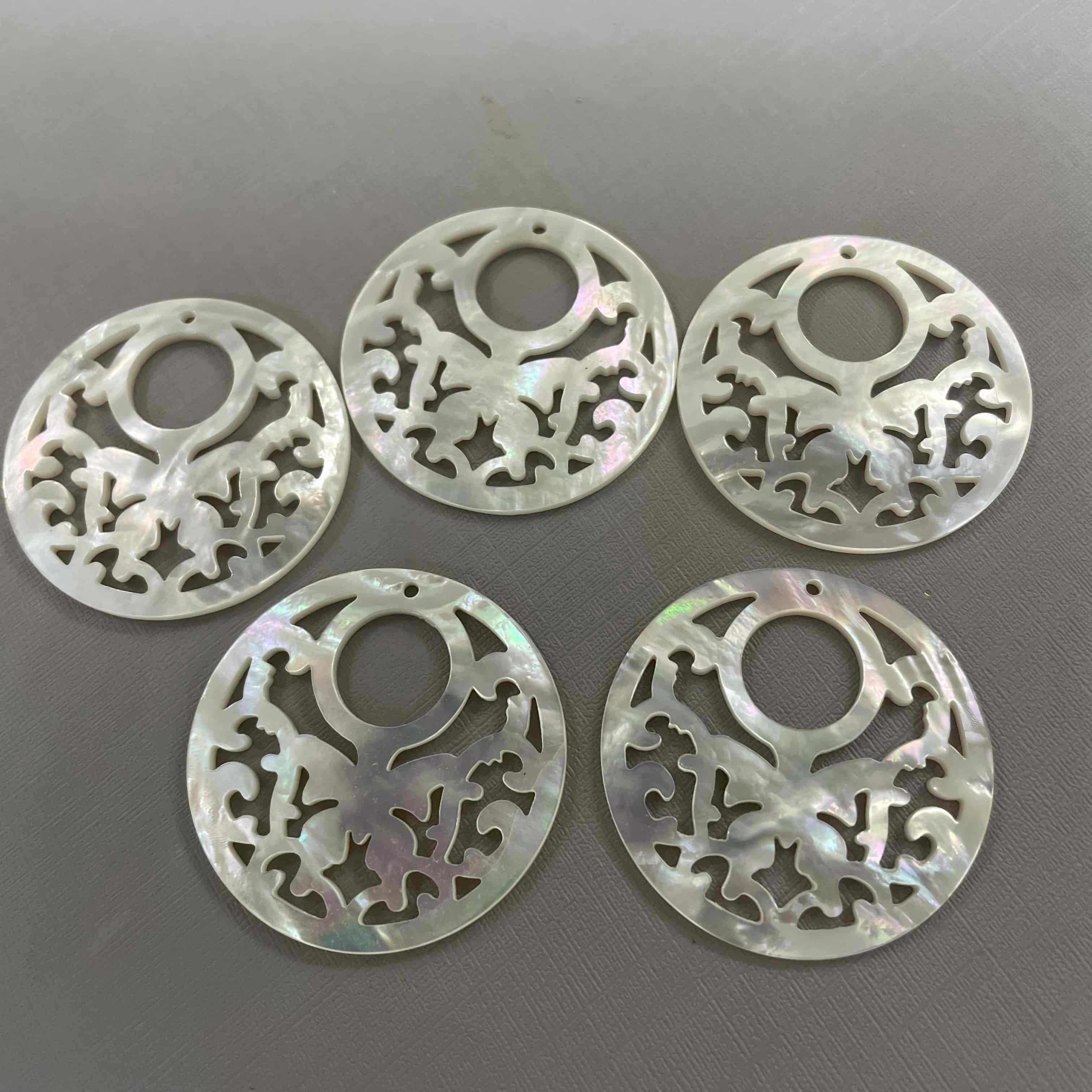 Home » Products » Carving Flower » Natural Mother of pearl round shape earrings design cutting hollow style big pendant for DIY design using white shell butterfly